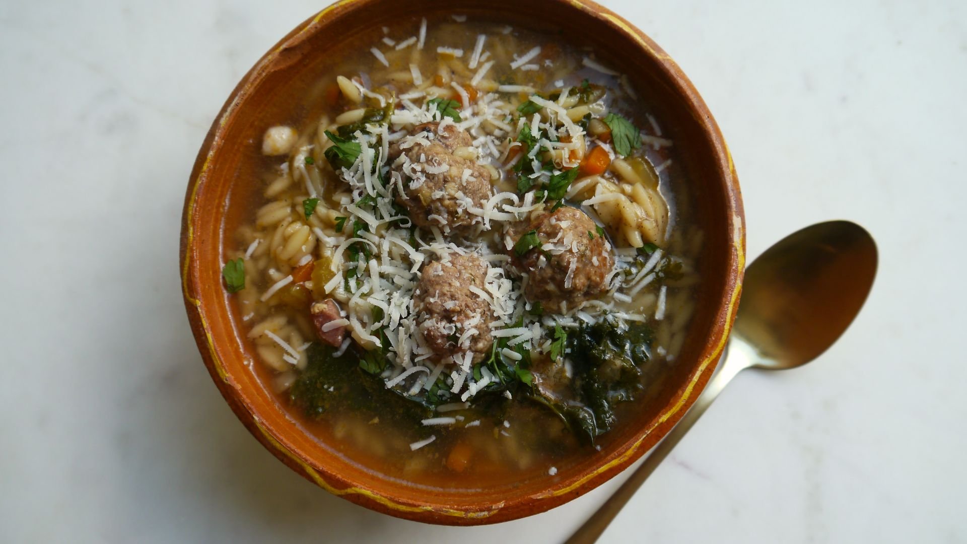 Italian wedding soup with orzo, served with freshly grated parmesan cheese