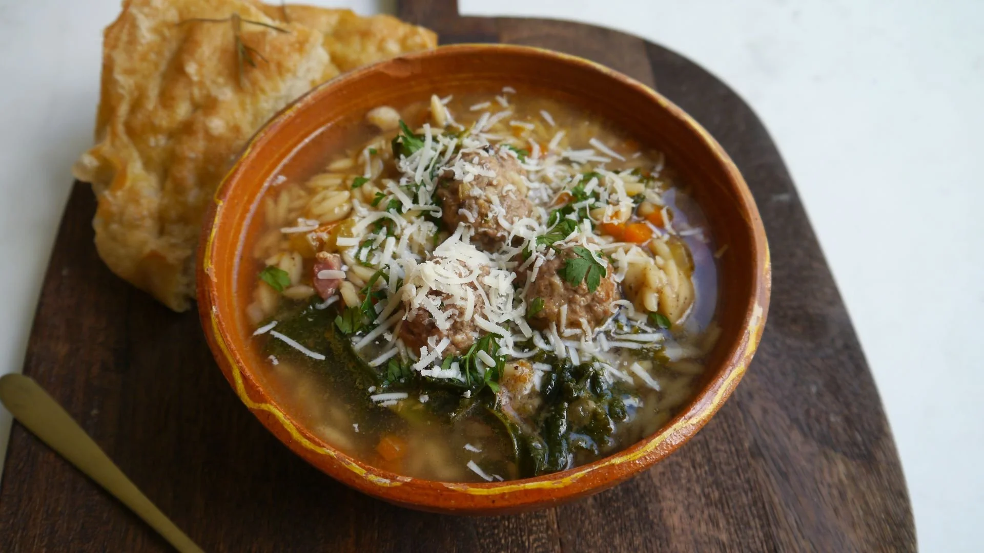 Italian wedding soup with orzo, served with fresh focaccia