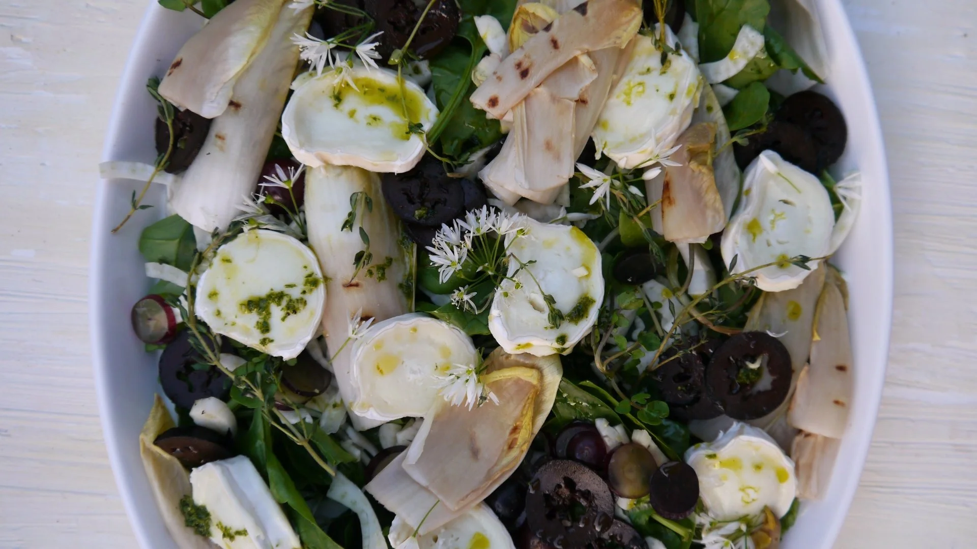 Greens, Goat’s cheese, Pickled Walnut & Wild Garlic Spring Salad Close Up