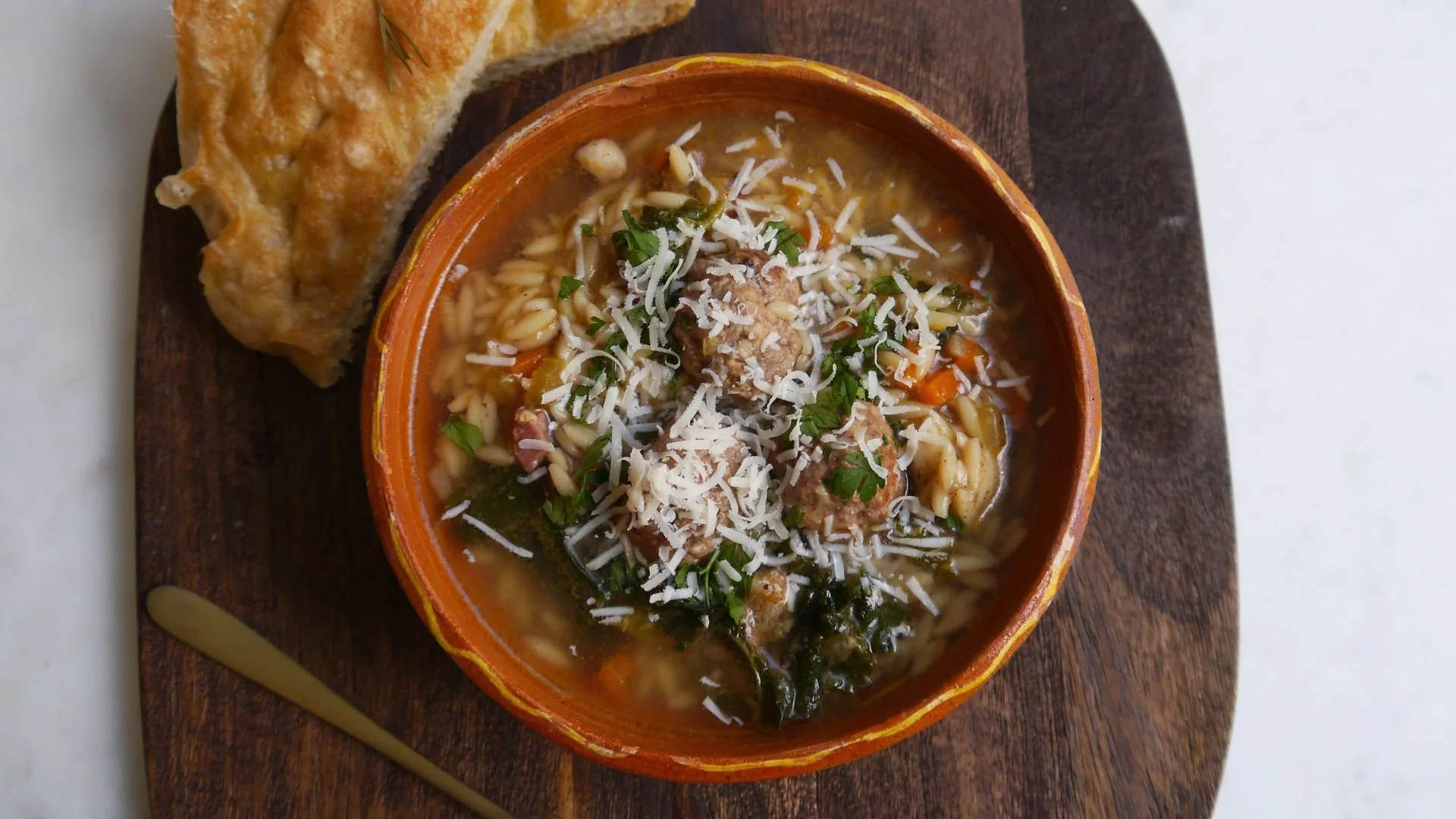 Italian wedding soup with orzo, served with fresh focaccia